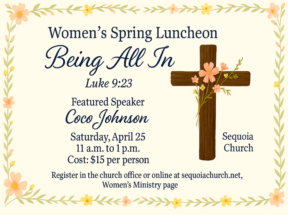Women 18 and older are invited to come together for support, encouragement and fun. Sequoia Women's ministry seeks to Encourage, Engage, and Equip women to live the life Christ wants for every Christian. To encourage each other, the Women's Ministry provides opportunities for fellowship, fun, sharing, caring and just developing lasting relationships with each other. To meet our goal to engage women, the Sequoia Women's Ministry seeks to involve women in personal spiritual growth and spiritual service to each other and to friends and neighbors. We believe God has called women to serve, not just be served.